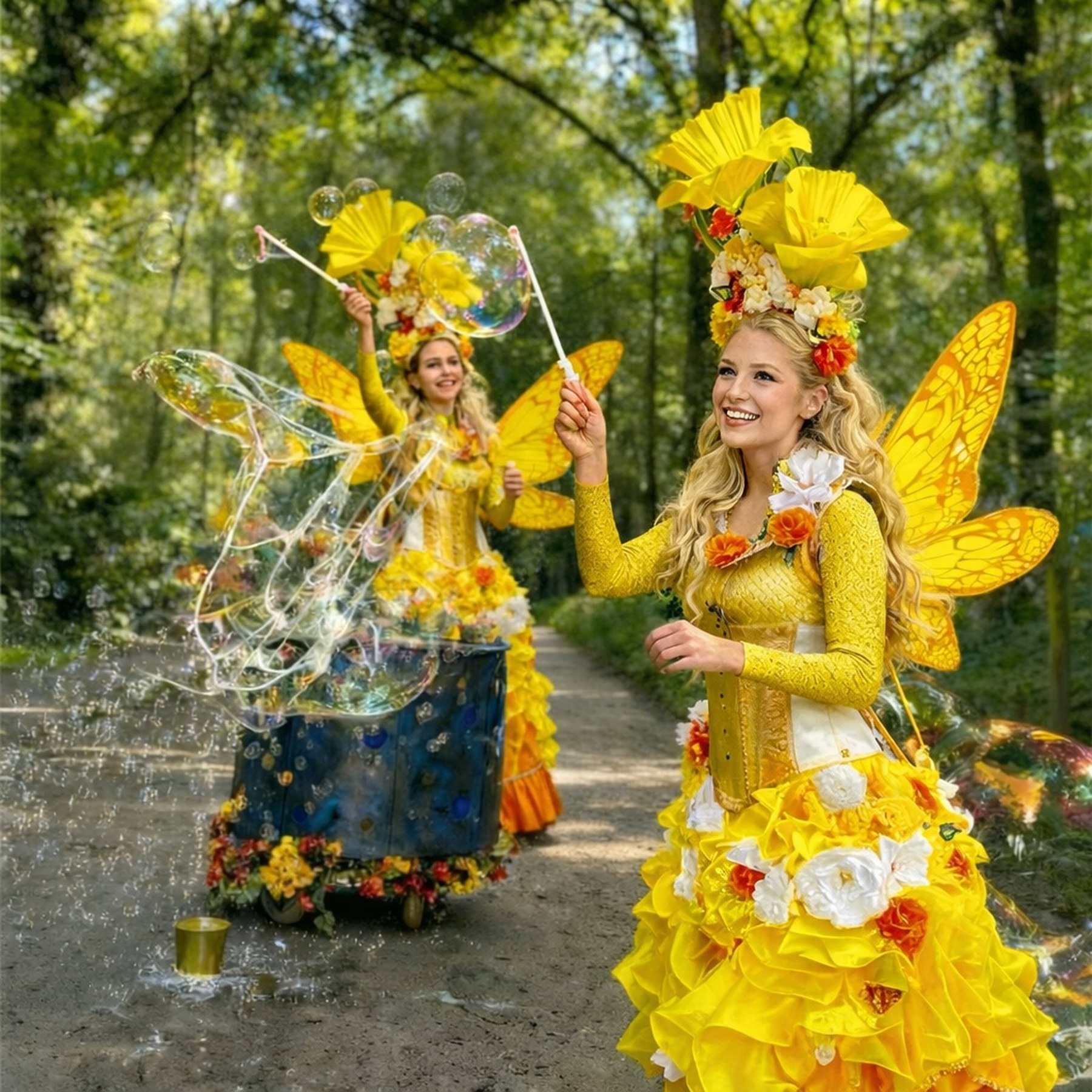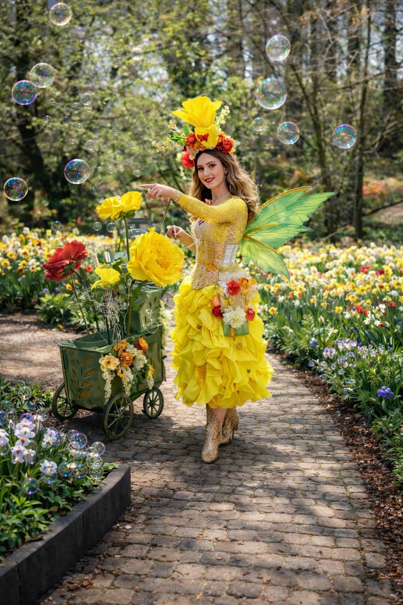 De Reuzenbellenfee is een betoverende mobiele entertainmentact waarbij gigantische zeepbellen, muziek en interactie samenkomen. Met haar mobiele kar vol bellenmagie beweegt deze kleurrijke fee zich door winkelcentra, straten, parken en evenementenlocaties, terwijl ze de mooiste reuzenzeepbellen door de lucht laat zweven.