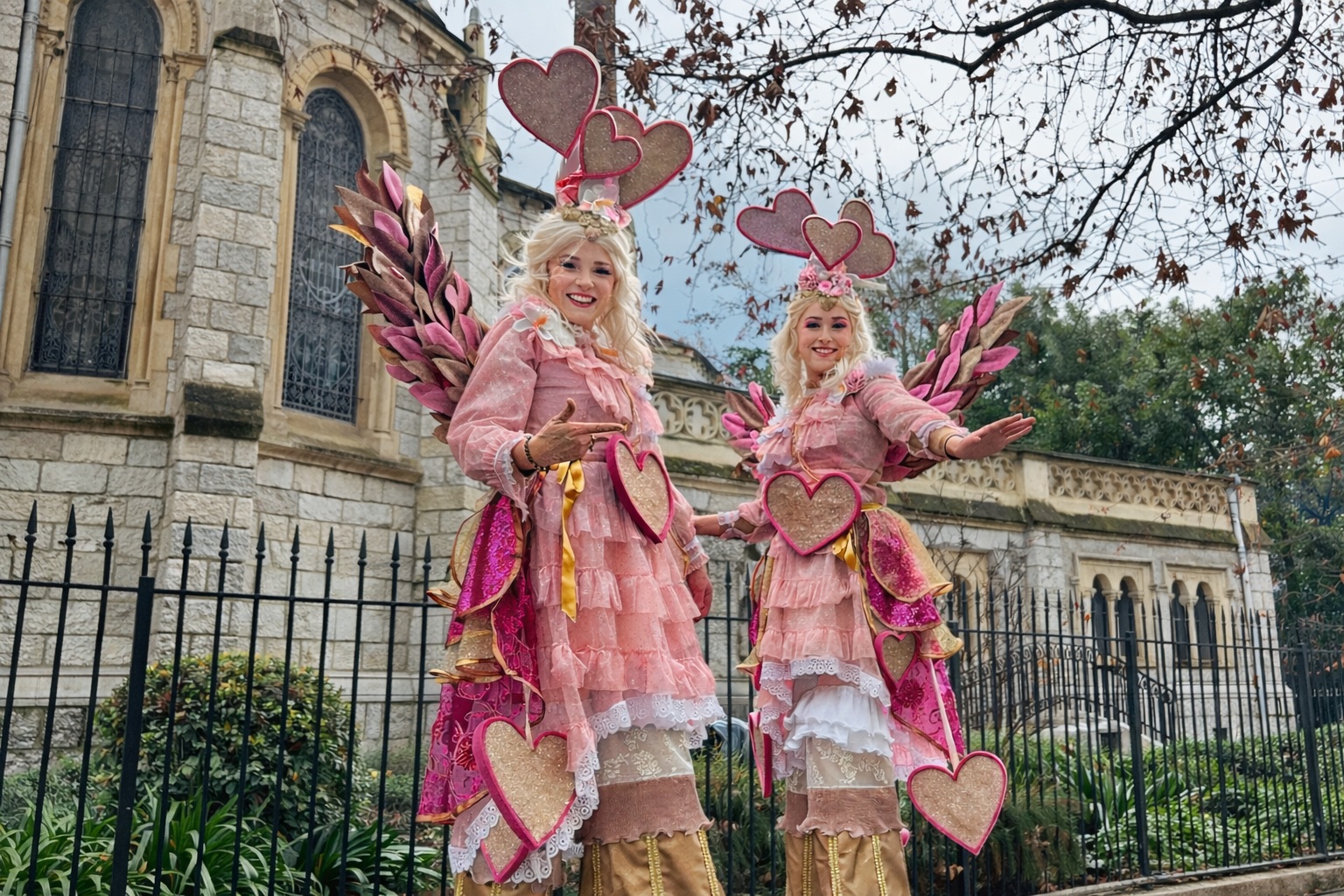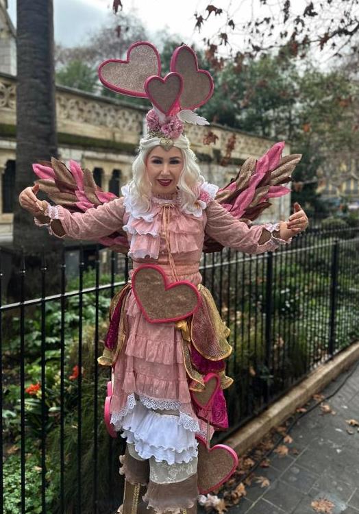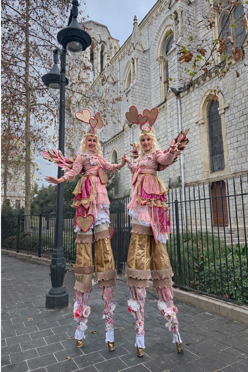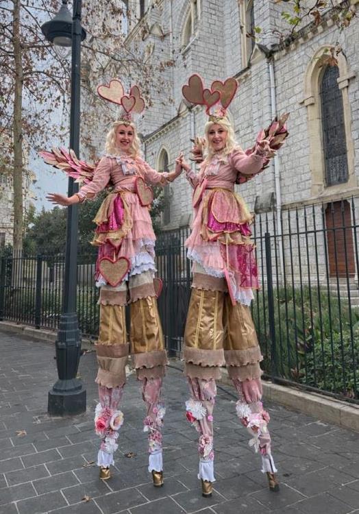 liefdes act, romantische steltenact, steltenact in roze, liefdesengelen op stelten, mobiele liefdes act, entertainment bruiloft, welkomstact bruiloft, romantische ontvangst act, trouwfeest entertainment, Valentijnsdag entertainment, love parade act, hartjes thema act, romantisch event entertainment, publieksentertainment liefde thema, roze parade entertainment