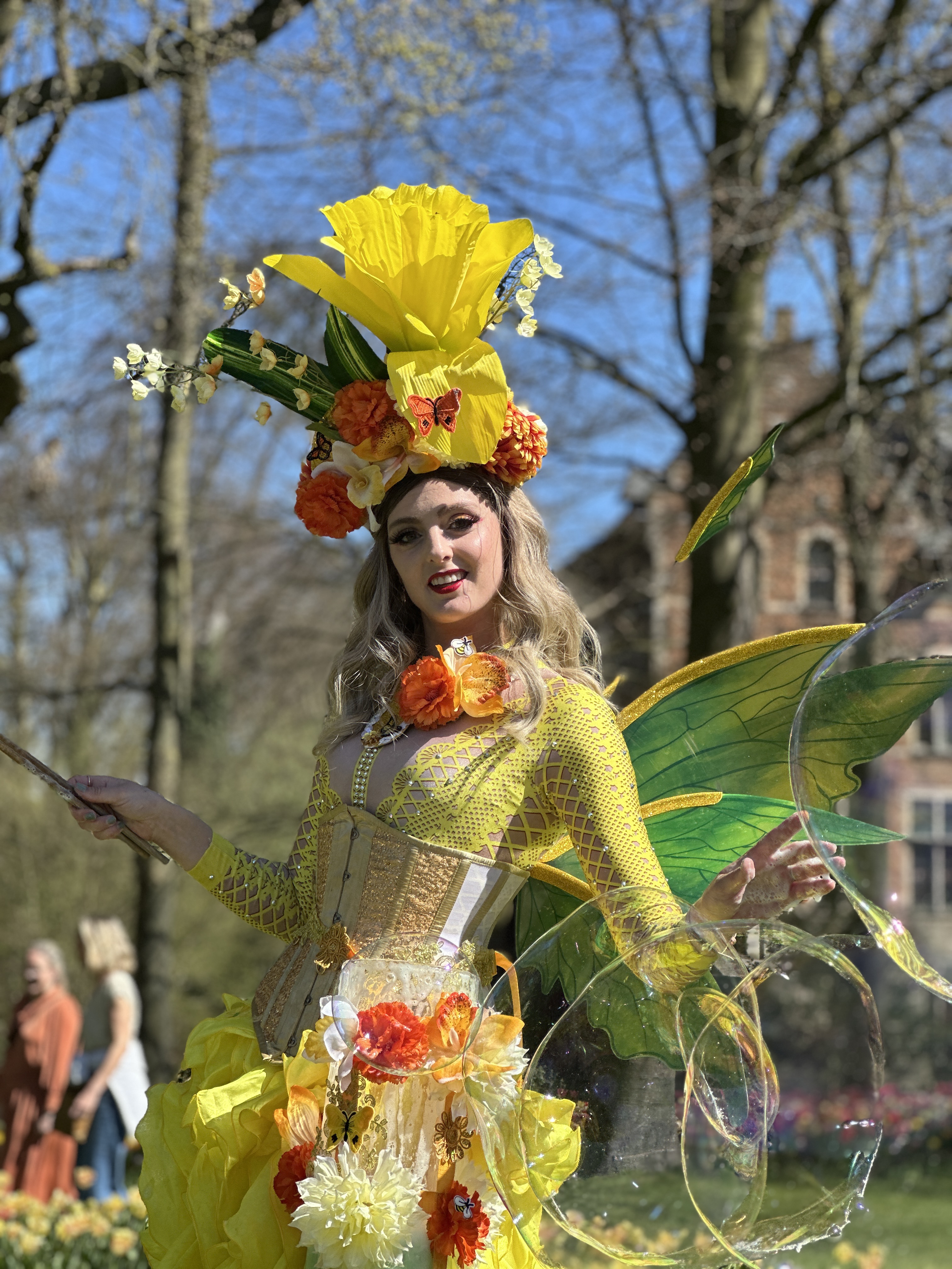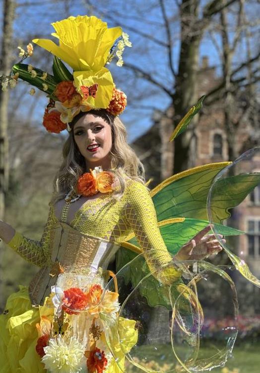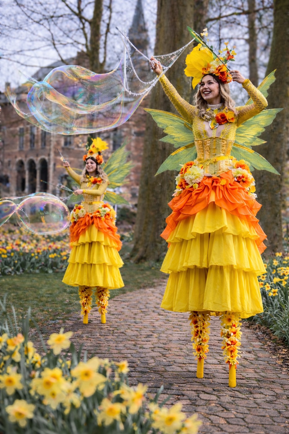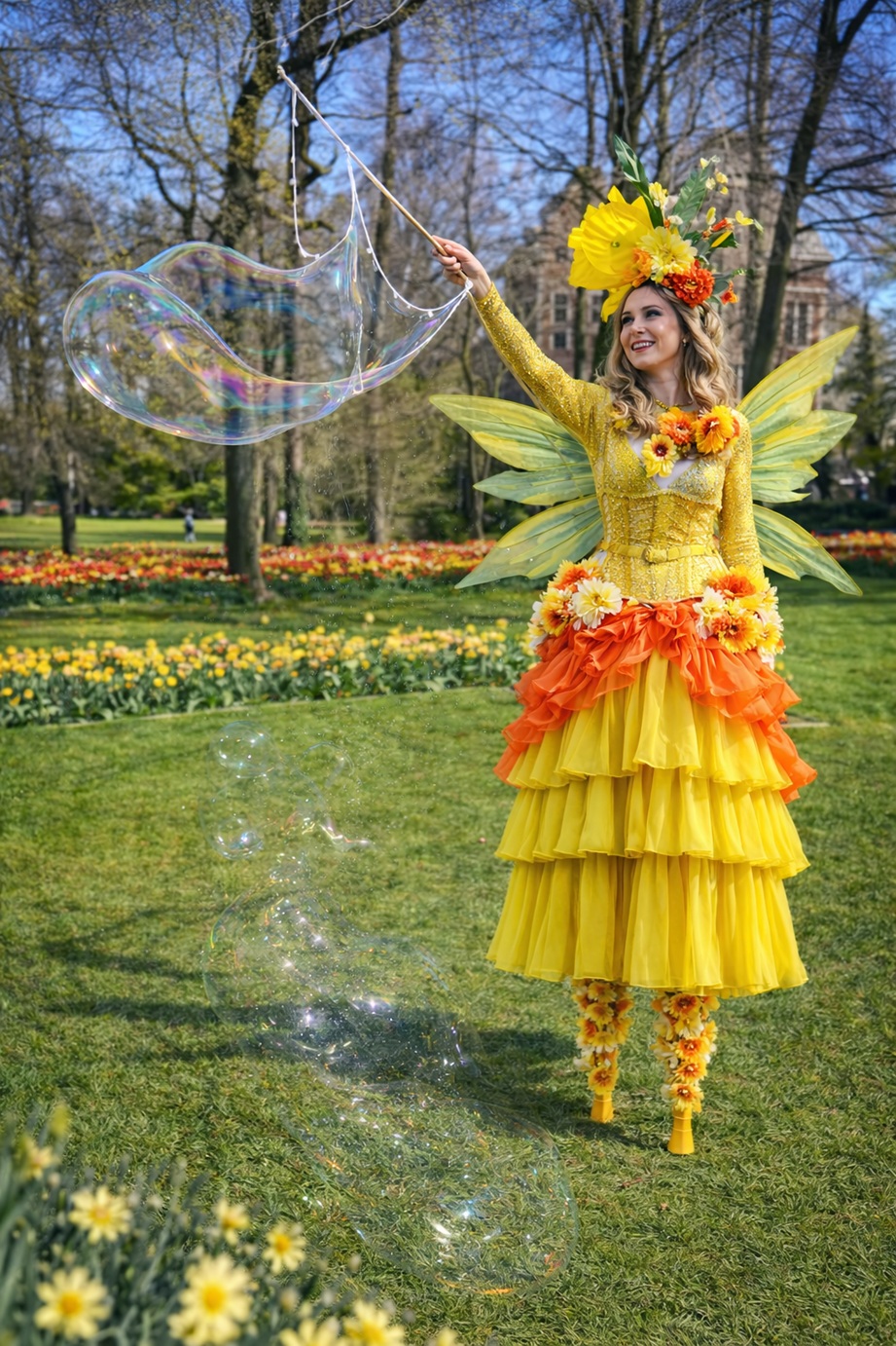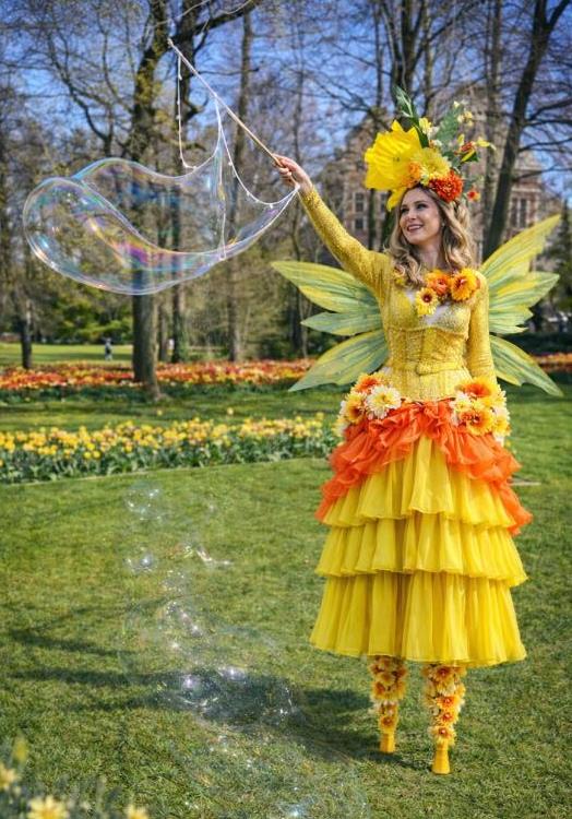 Op hoge stelten verschijnen stralende zonne-elfjes die met speelse elegantie de mooiste reuzenbellen tot leven brengen. In hun zomerse, zonnige kostuums bewegen zij sierlijk door het publiek, terwijl glinsterende bellen door de lucht zweven en langzaam uiteenspatten in het zonlicht.